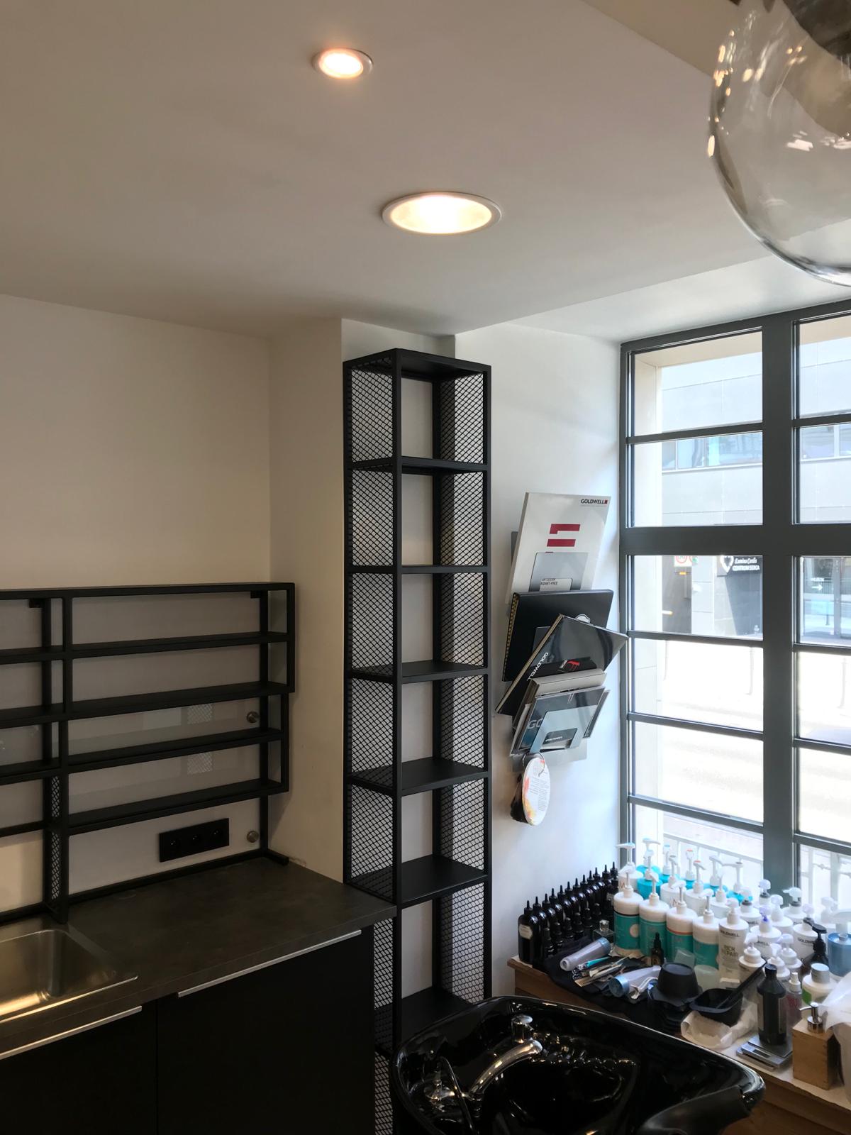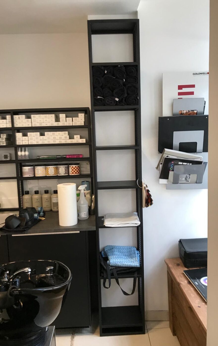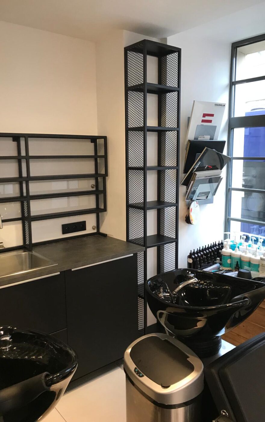 Dodatkowo, zaprojektowaliśmy przestrzenie podręczne, które są nie tylko praktyczne, ale także wpisują się w industrialny charakter wnętrza. Stalowe konstrukcje, pomalowane na czarno, zapewniają trwałość i estetykę, odpowiadając na potrzeby nowoczesnego salonu fryzjerskiego.