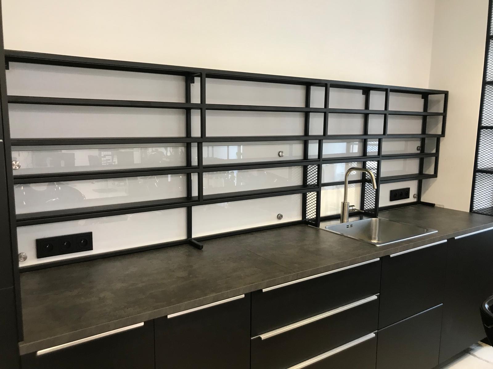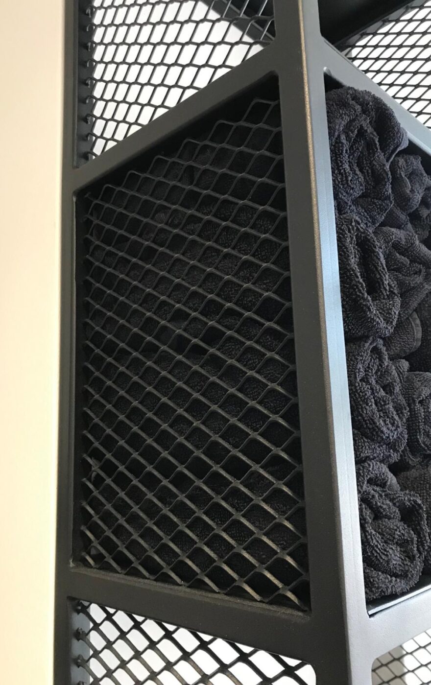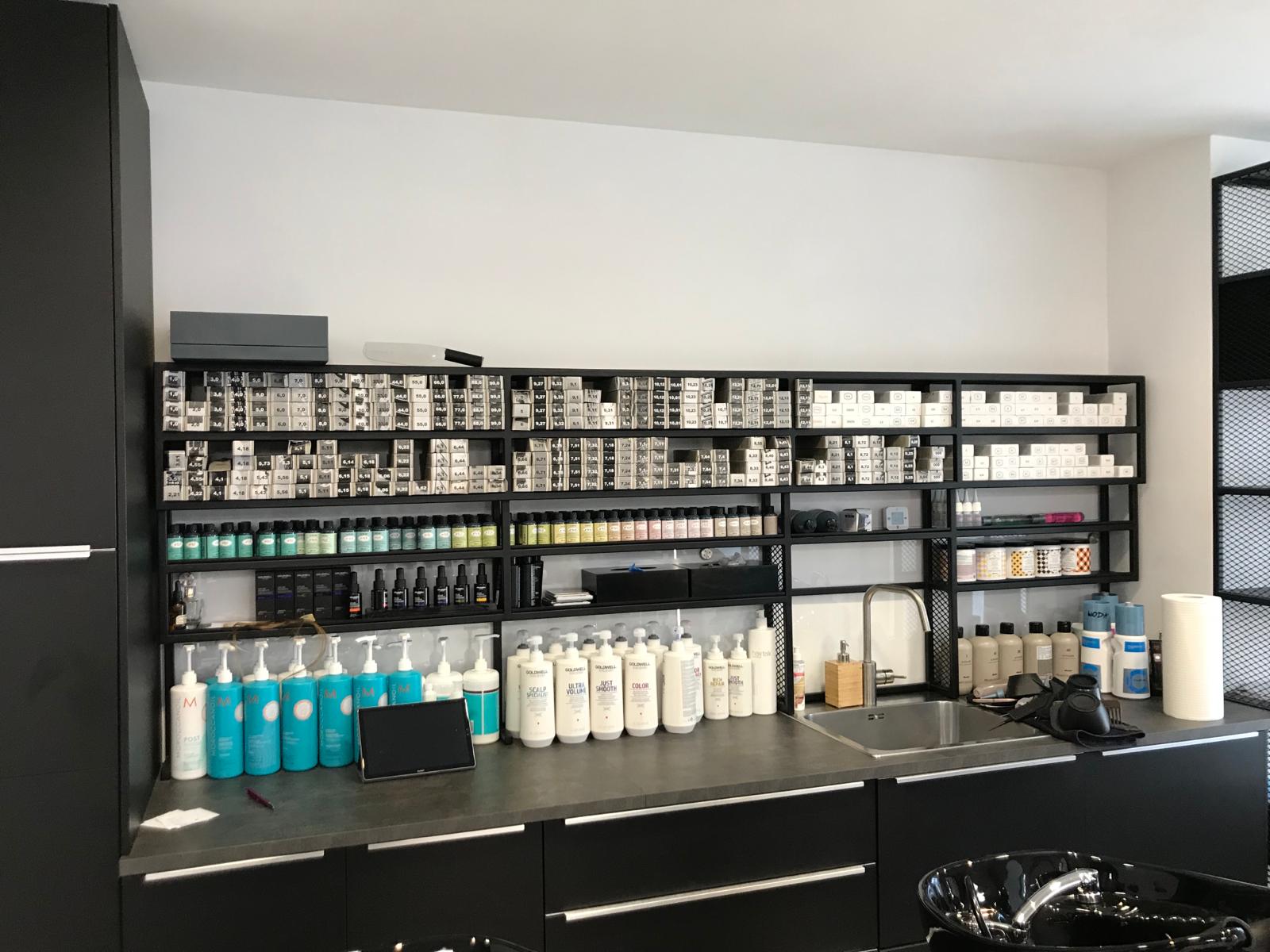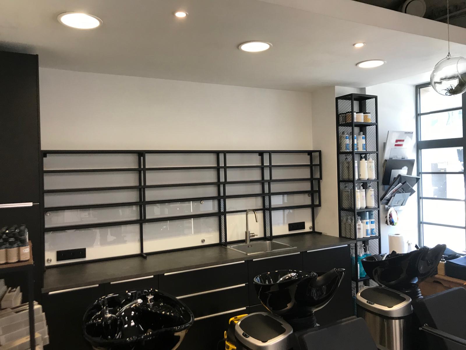 Dodatkowo, zaprojektowaliśmy przestrzenie podręczne, które są nie tylko praktyczne, ale także wpisują się w industrialny charakter wnętrza. Stalowe konstrukcje, pomalowane na czarno, zapewniają trwałość i estetykę, odpowiadając na potrzeby nowoczesnego salonu fryzjerskiego.