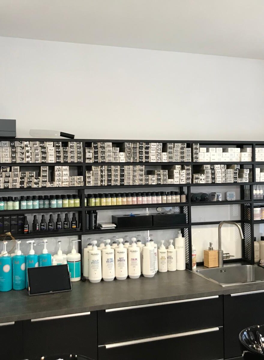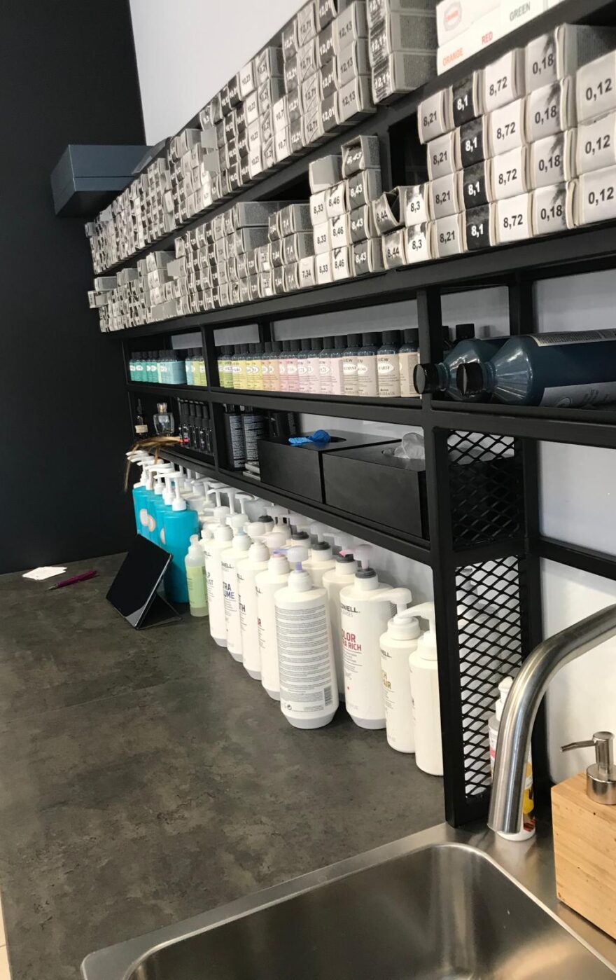 W salonie fryzjerskim Hairetic we Wrocławiu stworzyliśmy solidne i minimalistyczne stanowiska do mycia włosów. Kluczowym elementem jest półka za myjkami, wykonana ze stali i pomalowana na czarno, która łączy surowy styl z funkcjonalnością.